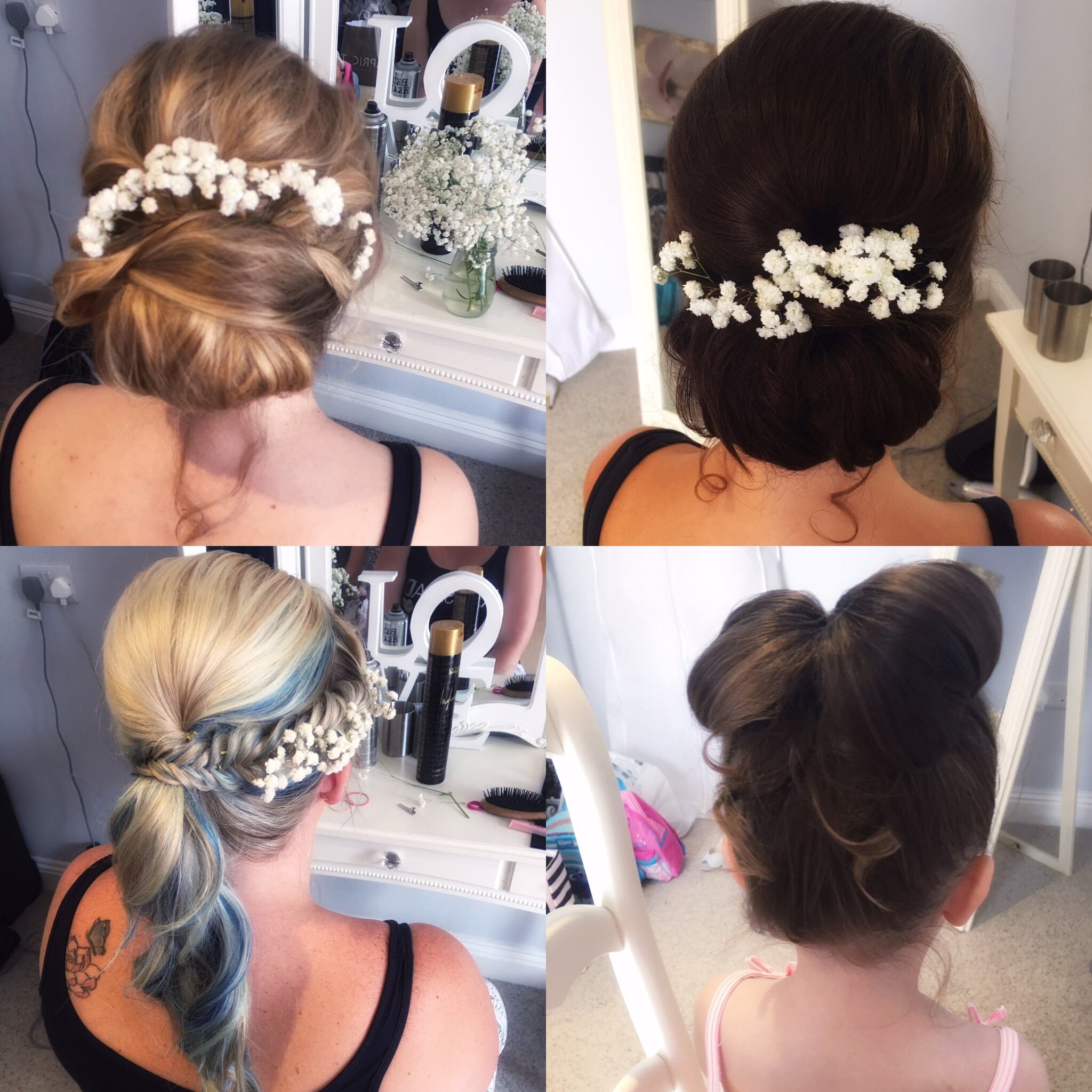 I started by doing the Bridesmaids hair, they had all chosen different styles which were lovely. Two of the went for a low Chignon style with Bridesmaid Laura choosing a more texturised finish, and Chelsey had a more ‘classic’ chignon. I kept them all soft around the face. Carla went for a lovely Fishtail braid into a curled ponytail which showed off the lovely blue/blonde colours in her hair. All the styles, along with Sophie’s Bridesmaid Donna who did her own hair were finished off with some Gypsophilia, an absolute must have for a summer barn wedding!