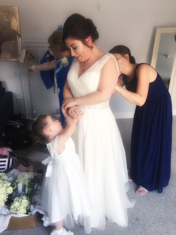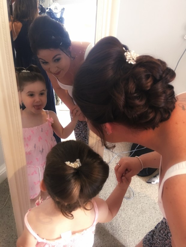 Then the little Princess arrived…..Sophie and Steve’s daughter Grace. She is the absolute model of her mummy and a dream to do hair for. She sat there loving the pampering from Jenna and I, telling me all about her Princess dress. I wanted something a bit special for Grace more than the usual Braid or Bun. So I decided to keep it young and soft, so I made a bun out of her hair. She also has really fine hair with her being so young so I did some curling on a very low heat and did some backcombing using Bedhead’s Oh Beehive matte dry shampoo. She was very happy with her beautiful hair and it complimented her Princess look!