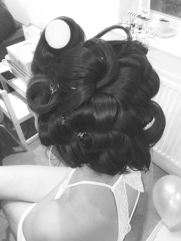 Kelly was sipping on a Lemsip (Oh No!), and myself and Melissa got to work on glamming the Bridal party up! I started by Pin curling Kelly’s gorgeous long hair to give the style some texture- the prep is very important to a Hairstyle.
