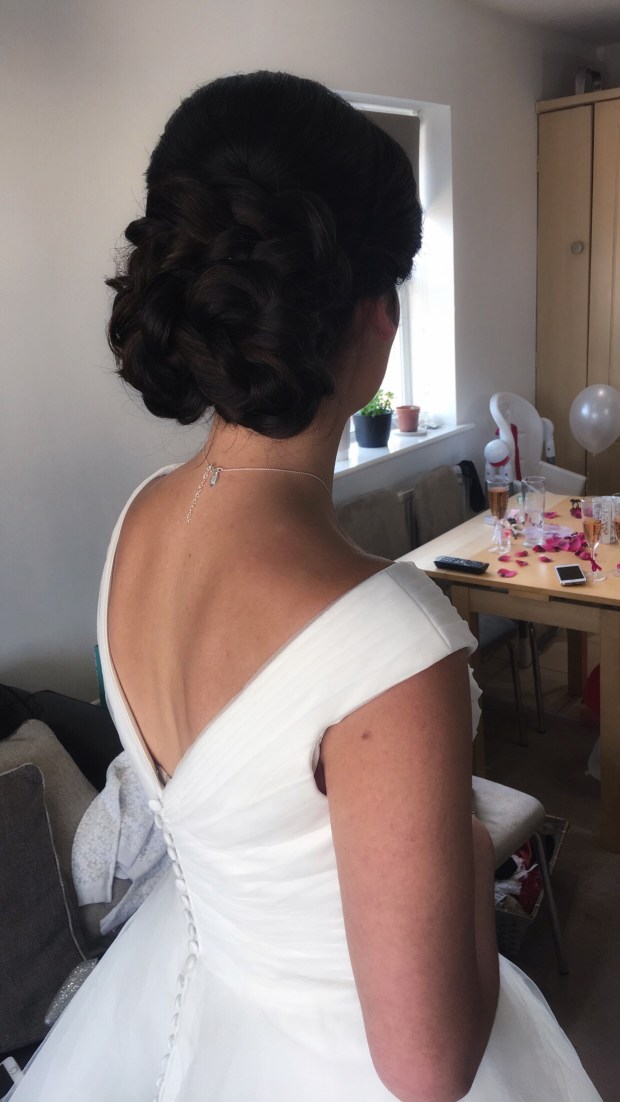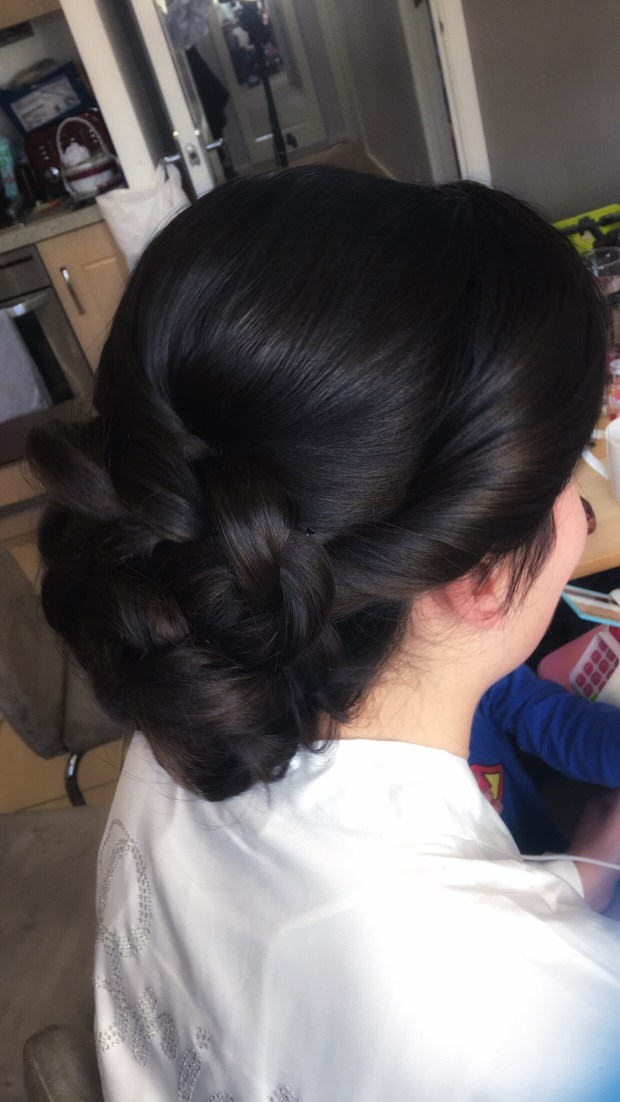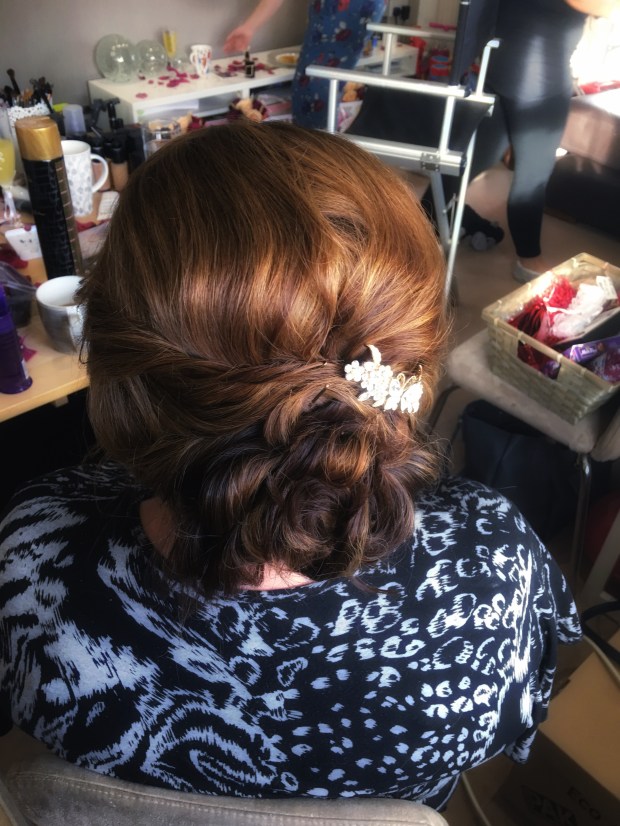 I then worked on Pam’s hair- Mother of the Bride. She showed me a lovely twisted updo that she liked so I started by smoothing and curling Pam’s hair. She has quite thick shoulder length hair which has a natural wavy curl so I wanted to make the style a bit more finished by smoothing it out.