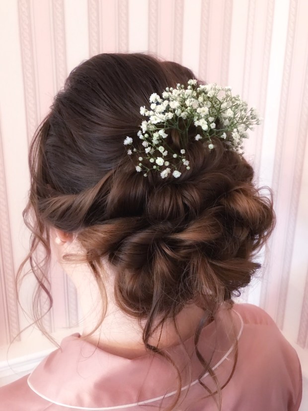 Maid of honour Charli, who Kaz has been friends with since 2007 (the same year she met husband to be Simon) went for a loose style which we trialled but then changed on the morning of the wedding to one of my more recent customised styles that Charli had loved, which looked amazing on the day, so we perfected it with some fresh Gypsophilia.