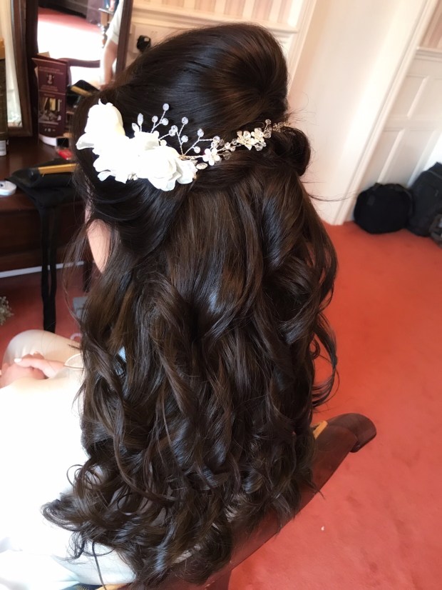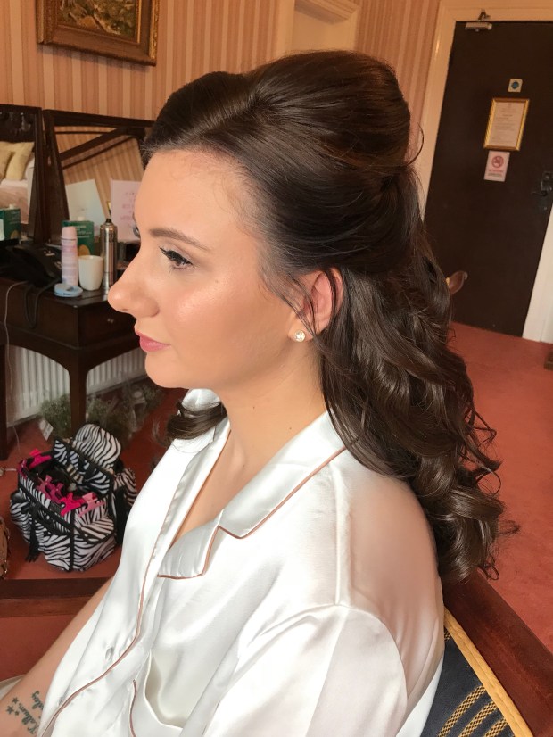 Kaz’s hair is just below shoulder length and quite thin but there is lots of it. We tried some styles with some extensions and chose the perfect one for Kaz, she knew that she wanted a half up half down style and that was the perfect choice!