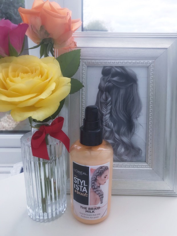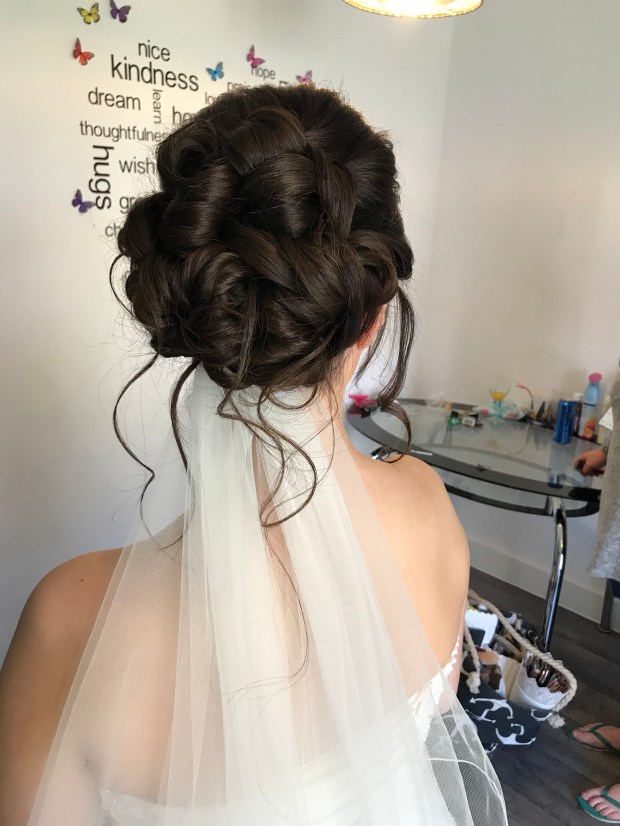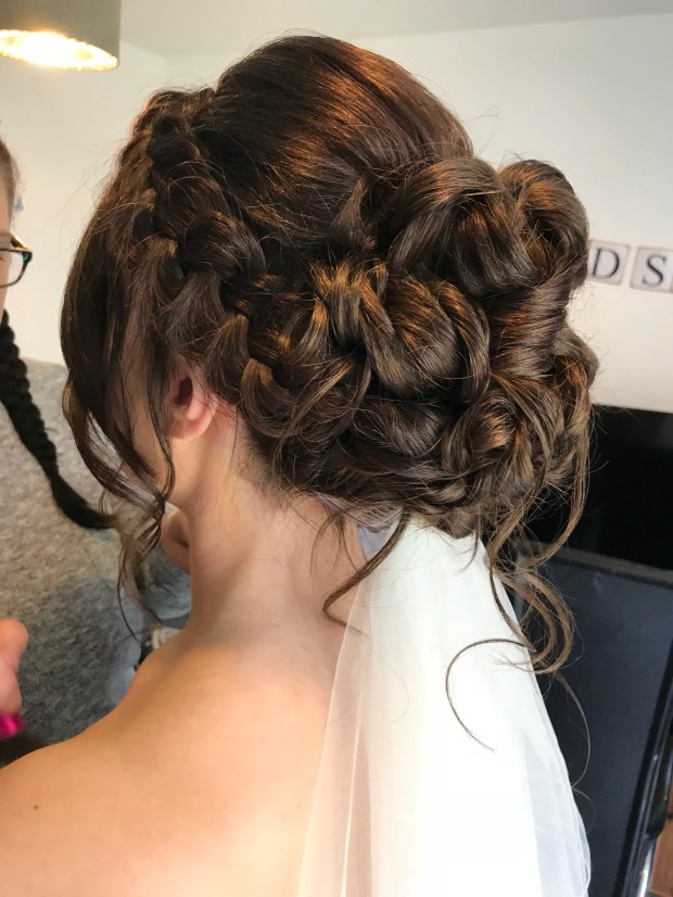 I took Rhiannon’s pin curls out and started styling. She wanted a nice thick dutch braid at the side of her up-do, so for some grip to make the braid stay in place I used the new L’oreal ‘The braid milk’, this stuff smells divine, it has coconut extract so will remind you of summer days! I then pinned all of Rhiannon’s beautiful curls up to form a gorgeous volumised updo.