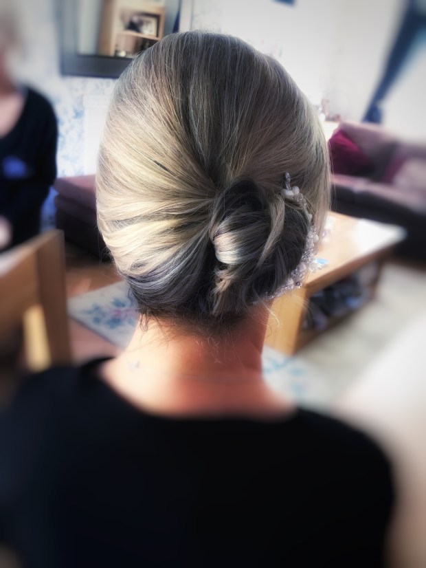 I then let Kate’s pin curls set as they were to be a great foundation for her style. So I started on her gorgeous mum Sue’s hair. Since I met Sue last year I have loved it when she comes back to have her hair done, she is one of the most loveliest women I have met and really made everyone feel so welcome. Sue has very thin hair but wanted a nice up-do to the side and to add a fascinator to go with her dress.