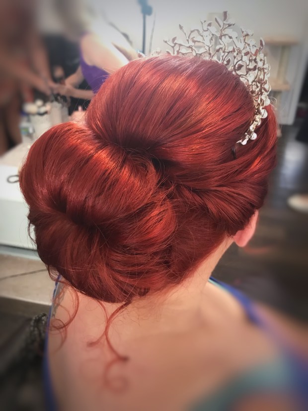 I started by curling Kayleigh’s hair and then started the style. The style was a dutch braid fanned out to look thick and then I added volume and styled into a bun with loose curls coming from it.